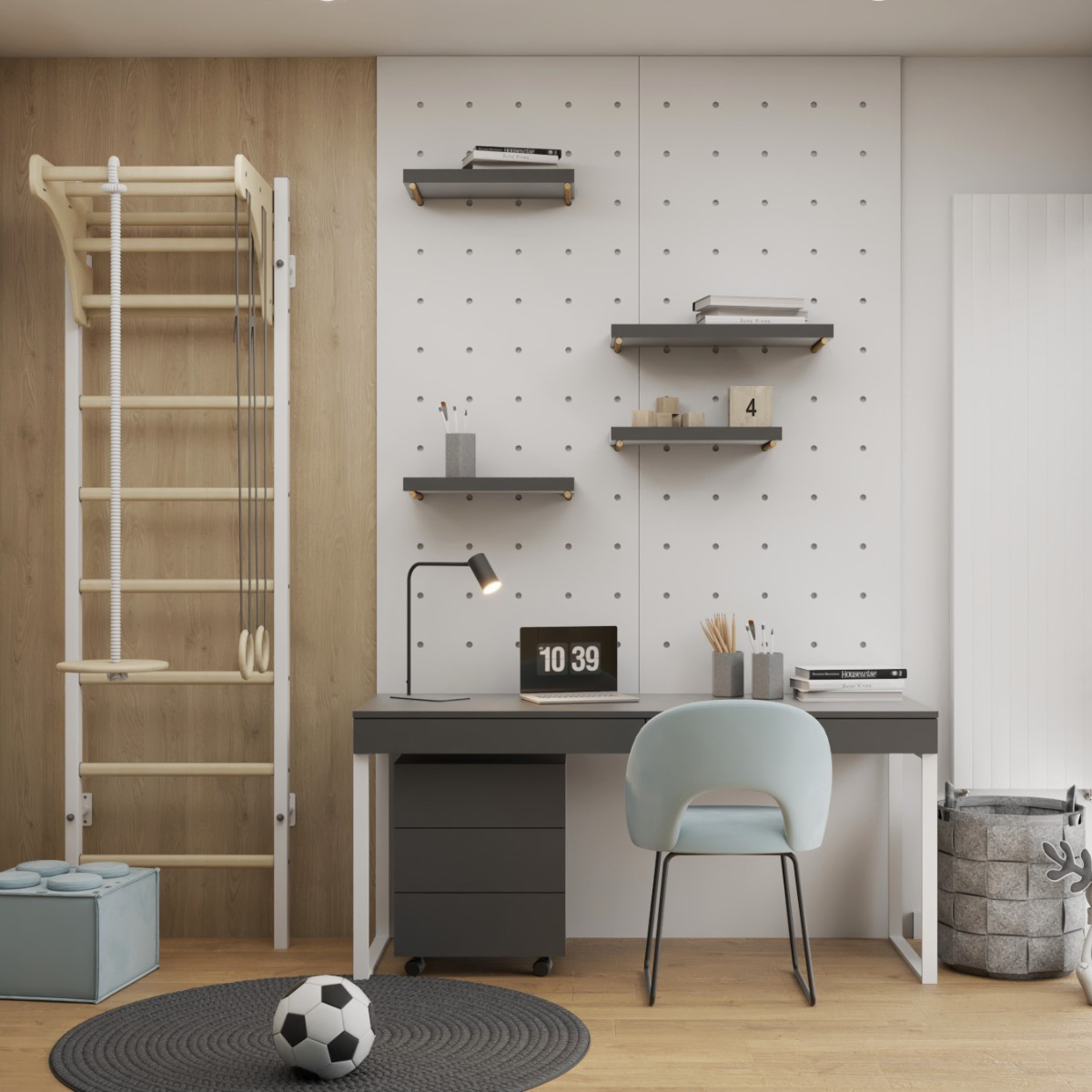 Została wyposażona w regulowany drewniany drążek do podciągania, blat biurka, kółka gimnastyczne i bawełniana lina z huśtawką.