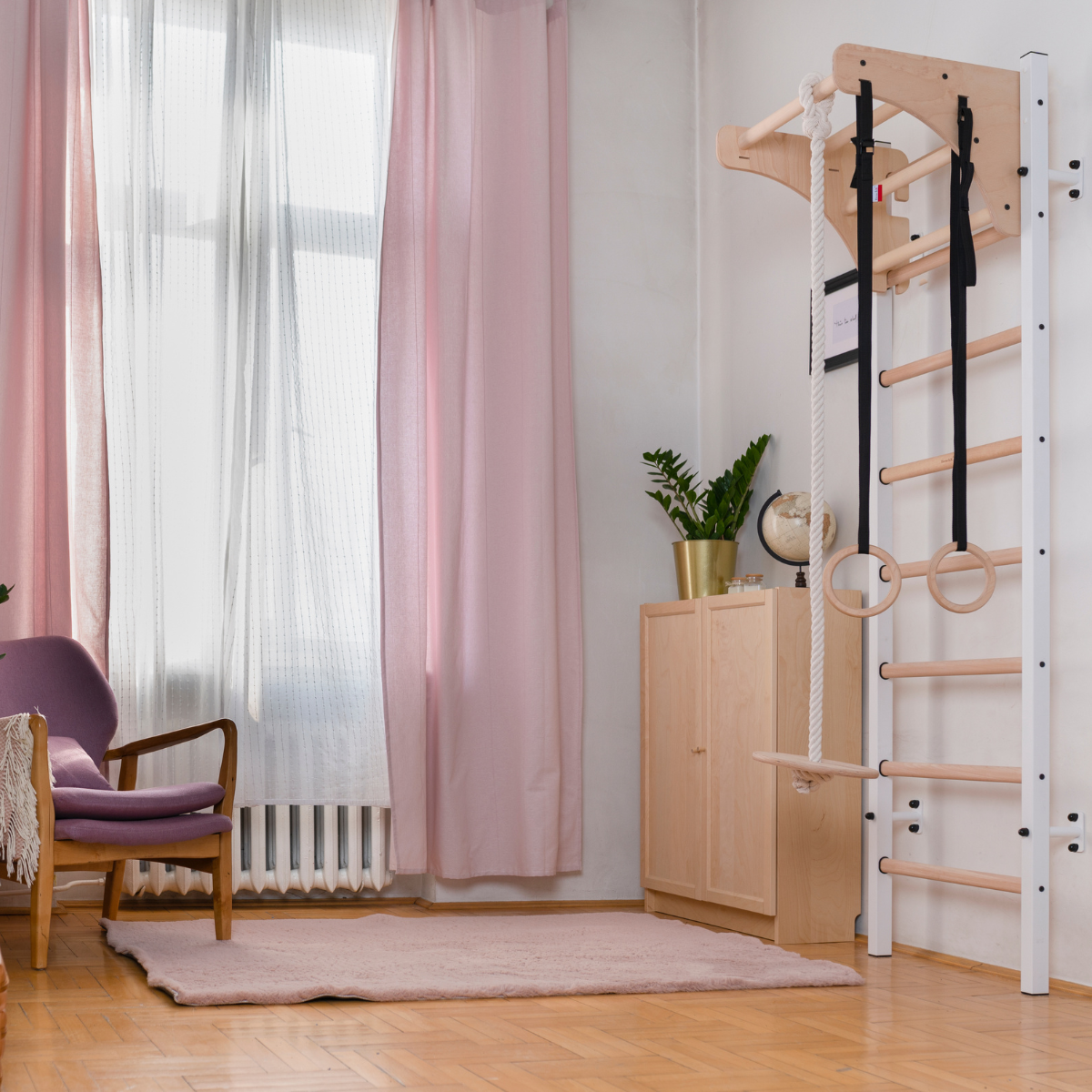 Zestaw wyposażony jest w drabinkę, drewniany drążek do podciągania, akcesoria gimnastyczne, 8 bukowych szczebelków drewnianych